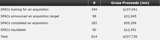 目前,市场上有多达344家的SAPC公司正在寻找标的,已经明确了并购标的SPAC有98家。