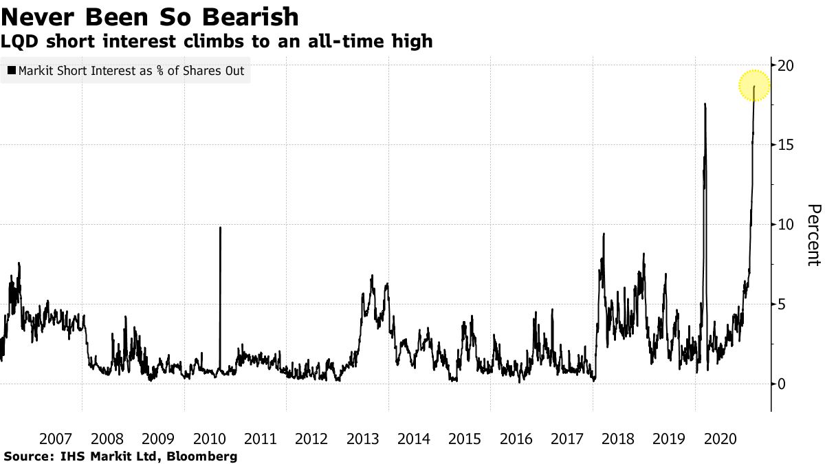 根据IHS Markit的数据,450亿美元的iShares iBoxx美元投资级公司债券ETF(LQD)的空头占已发行股票的百分比从年初的5.9%上升到18.7%,是该基金有记录以来的最高水平。而就在上周,这一比例仍为15%左右。今年迄今LQD的回报已下跌约5%。