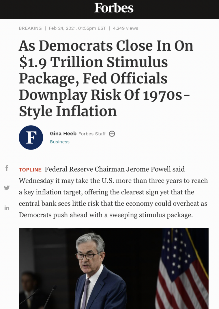 美联储数据显示,截至去年第三季度末,美国家庭持有的现金和现金等价物比2019年底多出2.2万亿美元,现在这个数字可能更高,如果规模高达1.9万亿美元的纾困计划出炉,更多现金将被注入美国经济,部分投资者正在押注通胀抬头。