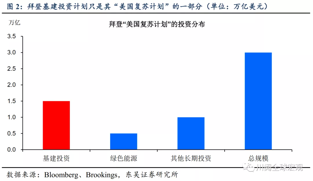 基建投资法案的规模有多大?从“美国复苏计划”来看,其不仅包括了传统的基建投资、还涵盖了绿色能源、研发、教育、社会保障等领域的长期投资,虽然具体的细节尚未公布,但预计在传统基建和绿色能源领域的投资将达到2万亿美元,上述其他领域的投资为1万亿美元,因此整个“美国复苏计划”的投资规模在3万亿美元左右(图2)。