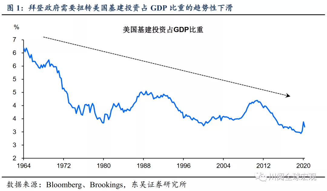 拜登为什么要推出基建投资计划?一方面,拜登政府需要扭转美国基建投资占GDP比重趋势性下滑(图1)。另一方面,根据我们了解到情况,在第一阶段财政刺激,即“美国拯救计划”(American Rescue Plan)预计3月在国会通过后,基建投资只是其第二阶段财政刺激,即所谓“美国复苏计划”American Recovery Plan)的一部分。其设想在美国经济走出疫情后,通过一系列长期投资来提高生产率,从而提升美国在全球的竞争优势。