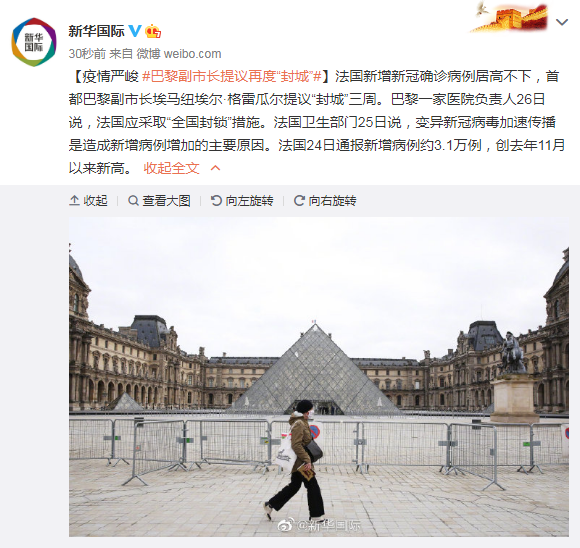 法国新增新冠确诊病例居高不下,首都巴黎副市长埃马纽埃尔·格雷瓜尔提议“封城”三周。巴黎一家医院负责人26日说,法国应采取“全国封锁”措施。法国卫生部门25日说,变异新冠病毒加速传播是造成新增病例增加的主要原因。法国24日通报新增病例约3.1万例,创去年11月以来新高。