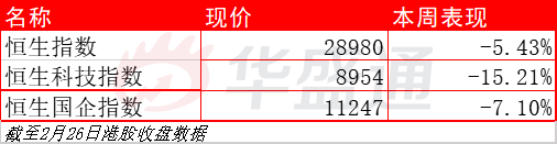 恒生指数周跌5.43%,报28980;恒生科技指数周跌15.21%,报8954;国企指数周跌7.10%,报11247。