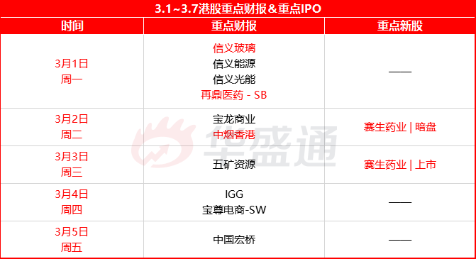 财报方面,下周信义玻璃、信义能源、再鼎医药-SB、中烟香港披露财报;新股方面,赛生药业周二暗盘,周三上市。