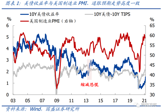 在前期报告《美债收益率上行会有多快?——兼评1月FOMC会议》中,我们曾指出美债收益率的中长期走势主要由经济表现、通胀走势、货币政策共同决定,需注意的是,美债反映的是经济的边际变化,而非同比增速;此外,美债反映的是市场对于未来通胀的预期,因此美债收益率往往领先通胀变化。具体来看,美债收益率与美国PMI、美国通胀预期(美债与TIPS利差)的走势均高度一致,而在美国PMI抬升叠加通胀预期回升时,美债收益率往往快速上行,这也是过去几个月对应的情形。