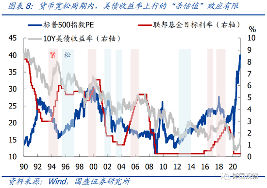 3.历史经验显示,美债收益率快速上行导致的“杀估值”效应,主要集中在美联储收紧货币政策期间。由于巨额货币宽松,当前美股并不存在严重泡沫。往后看,美股需要较长时间的盈利修复来消化高估值,因此整体表现不会太好;但鉴于美联储仍将维持宽松、美债收益率后续上行空间有限,美股不存在持续大幅回调的风险。