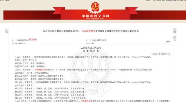 日前,裁判文书网上公布了一份关于江西银行股份有限公司(01916.HK)的二审民事判决书。据了解,该案件由江西省高级人民法院审判,涉案主体分别是江西银行股份有限公司南昌高新支行(以下简称为"江西高新支行")和江西港胜实业有限责任公司(以下简称为"港胜实业")。资料显示,双方均因不服有关金融借款纠纷案的一审判决而上诉。
