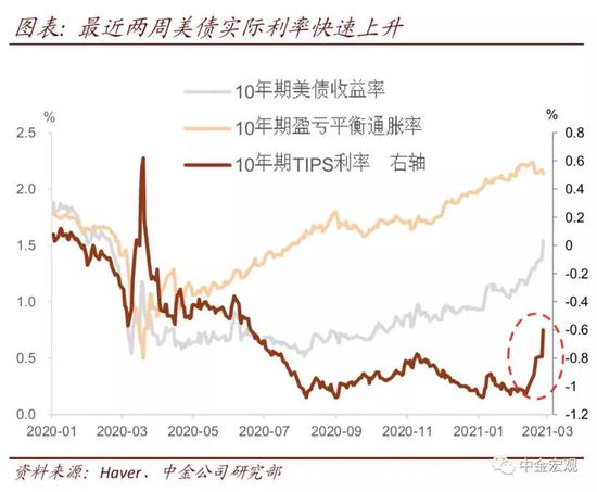 最近两周美债实际利率快速抬升,加剧金融市场震荡。2月25日10年期美债收益率上升至1.54%,盘中一度突破1.6%,发达经济体长期国债收益率普遍上升。去年下半年以来,美债收益率上升主要由通胀预期上升驱动,实际利率相对平稳,但过去两周实际利率快速抬升。2月10日至25日,10年期通胀保值债券(TIPS)利率上升46个基点,超过同期10年期名义国债收益率39个基点升幅。此前通胀预期上升伴随风险资产价格上涨,但最近两周实际利率快速上升导致金融市场波动加大。