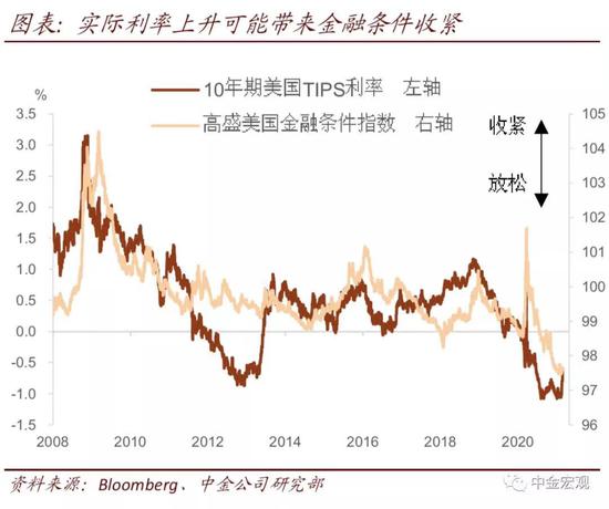 尽管美联储官员持续释放偏“鸽派”信号,但实际利率大幅上升反映了市场对货币政策提前收紧的担忧。美联储主席Powell周二在听证会[1]上表示,通货膨胀率仍低于2%的长期目标。货币政策维持宽松有利于促进经济增长和通胀恢复,最终有可能带来货币政策收紧,实际利率上升可能开始反映这一预期。实际利率是影响全球资产再平衡的重要因素,实际利率上升会导致金融条件收紧,令风险资产承压。同时,金融条件收紧也会抑制企业投资,不利于经济复苏。