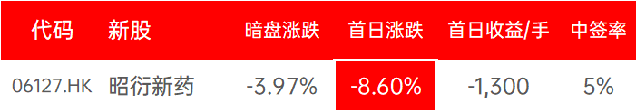 昭衍新药(06127)H股,首日挂牌,低开2%,全日低收138元,较上市价151元低8.6%,成交1,166.7万股,涉资16.75亿元。不计手续费,每手100股,账面蚀1,300港元。招股书显示其核心业务药物非临床安全性评价在国内市场份额为15.5%,排名居首。