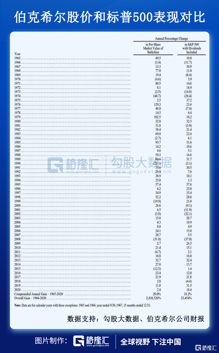 但长期来看,1965-2020年,伯克希尔每股市值的复合年增长率为20%,明显超过标普500指数的10.2%,而1964-2020年伯克希尔的市值增长率是令人吃惊的2810526%,也就是28105倍多,而标普500指数为23454%,即234倍多。