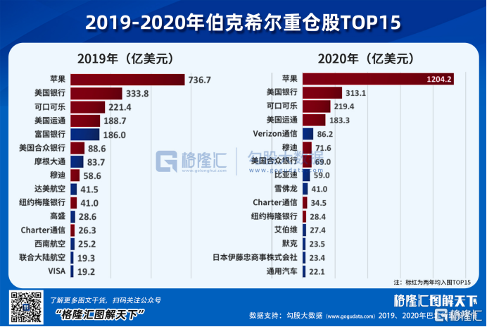 截至2020年12月31日,伯克希尔哈撒韦公布的去年四季度末前十大持仓如下: