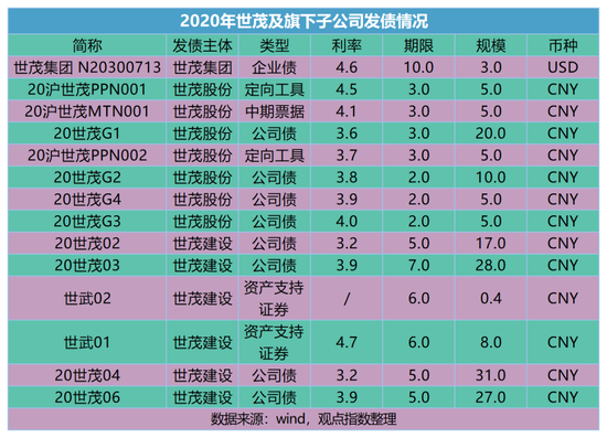 据观点指数统计,世茂集团2020年通过港股上市平台仅发行一笔美元债,年限10年、利率仅为4.8%。而世茂股份和上海世茂建设的融资动作频频,方式也较为多元化,除了公司债、票据等,还包括CMBS、ABS等途径。