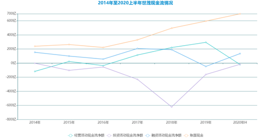 2020上半年,世茂现金流情况有所转变,经营活动现金流净额为-19.48亿元,投资活动现金流净额为-16.49亿元,但融资活动现金流净额涨至135.25亿元。