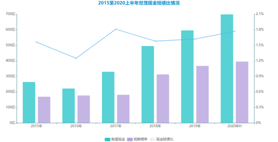 世茂的财务数据向来以稳健著称,账面现金较为充裕,2020上半年达到699.21亿元,完全覆盖短期债务。