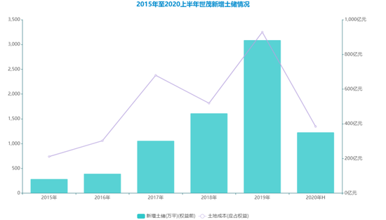 2020年上半年,世茂新增土储1232万平方米,总土储(权益前)达到8393万平方米,总货值1.45亿元。