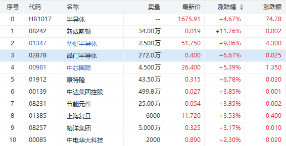 华盛资讯3月1日消息,港股半导体芯片概念集体大涨。截至发稿,华虹半导体涨9.06%,晶门半导体涨6.67%,中芯国际涨5.39%,上海复旦涨3.53%。