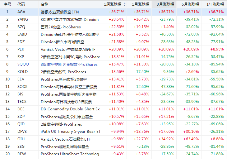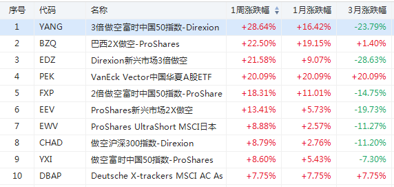 由于美股主要股指中纳指跌幅最多,因此3倍做空纳指的SQQQ在该分类中涨幅遥遥领先,上周涨超15%,紧随其后的同样是做空纳指的ETF,只是杠杆低一些。(HSPX已退市)。