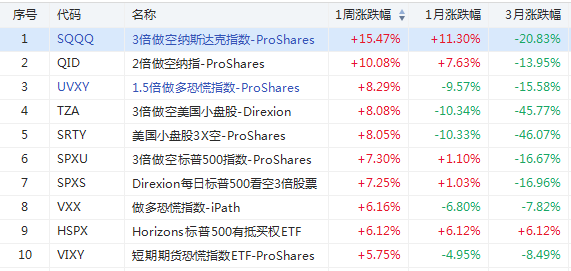 市场波动加大之时,恐慌指数往往同时飙升,1.5倍做多恐慌指数的UVXY上周涨超8%,超过了3倍做空标普500指数ETF的涨幅。