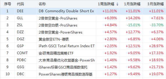 在此形势下,黄金价格受到打压,黄金期货上周连跌4日,收于6月以来的最低水平。2倍做空黄金的GLL上周涨超6%,DZZ涨近5%,成为表现最佳的商品期货。