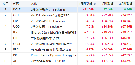 大跌一周年之际,原油价格近期倒是走出强势行情,2月份,美布两油期货均上涨约18%。表现在ETF上,能源ETF上周逆势上涨,成为少数上涨的非反向ETF,十分争气地霸榜了能源ETF涨幅榜,其中油服ETF OIH上周涨近10%,2倍做多能源ETF ERX涨超8%。