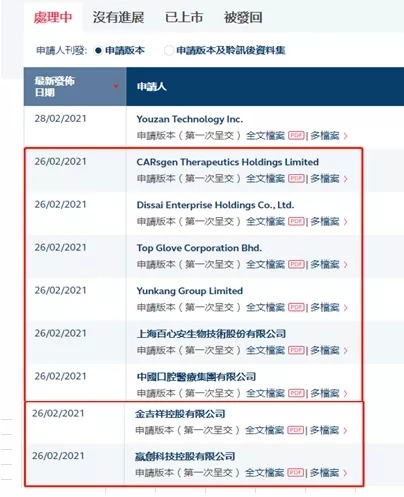 2021年2月26日,港交所网站披露了 8 家拟上市企业的招股书,其中主板 6 家、GEM(创业板) 2家。这是继2018年7月3日15家、2018年9月3日10家、2020年2月28日8家之后,又同一天出现多家递表的盛况。
