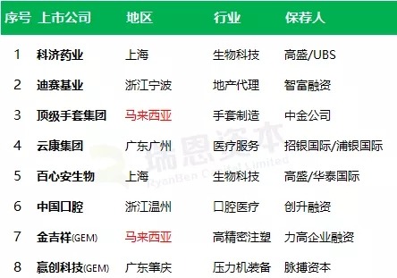2、按递表企业的行业来看,5 家(科济药业、顶级手套集团、云康健康、百心安生物、中国口腔医疗)来自医疗健康行业、1家(迪赛基业)来自房地产相关行业、2家(金吉祥、赢创科技)来自制造行业。