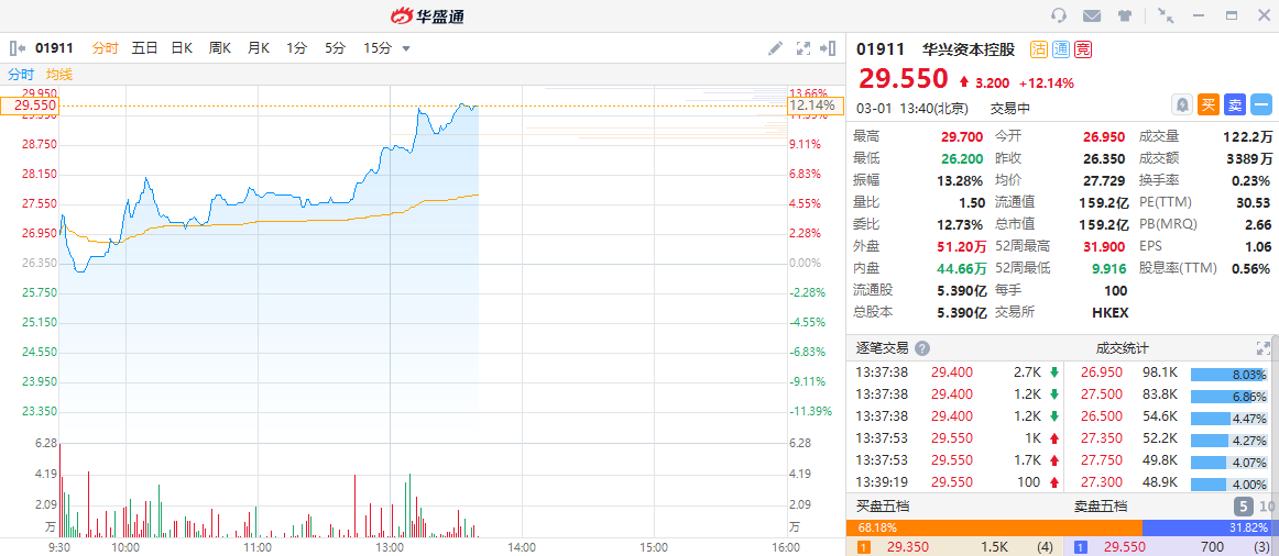 华盛资讯3月1日消息,华兴资本午后持续攀升,一度涨超12%,接连突破所有均线。截至发稿,华兴资本涨12.14%,现报29.55港元每股,暂成交3389万,当前总市值为159.2亿港元。