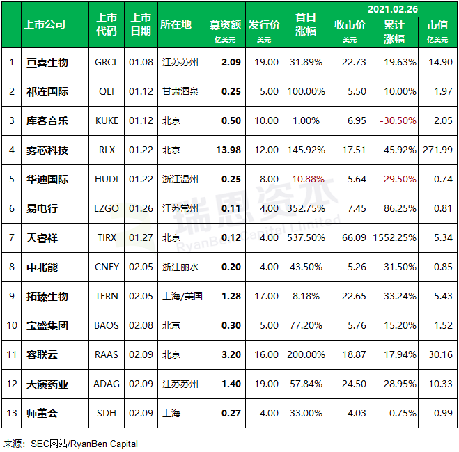 2021年前2个月,共有13家中国企业在美国IPO上市(不考虑SPAC、OTC上市),共募资23.94亿(美元,下同), 其中3 家在美国纽交所上市、10家在纳斯达克上市。