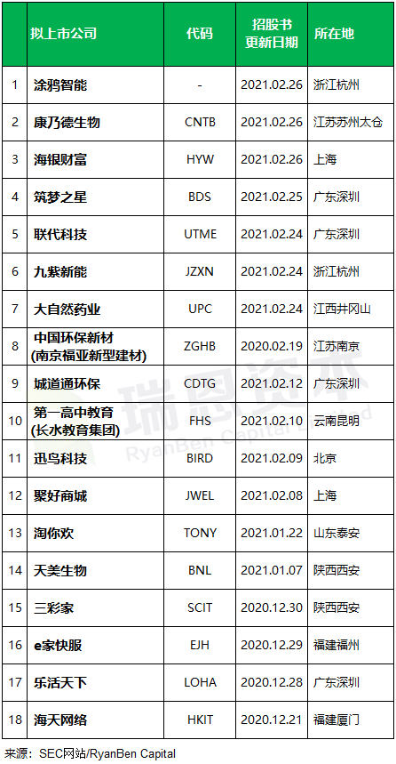 Ryanben Capital统计到,最近在美国证监会(SEC)更新招股书或其他文件的拟上市中国企业,至少有18家。