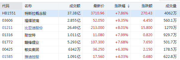 特斯拉概念股集体上涨 福耀玻璃涨超9%比亚迪股份涨8%