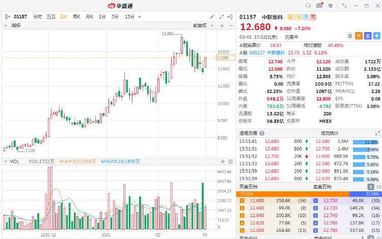 智通财经APP获悉,据媒体报道,来自安徽、湖北、江苏、上海等地区的部分挖掘机主流品牌代理商相继发布涨价公告,对所代理销售的挖掘机每台提价0.5万-3万元不等。工程机械股集体走高,截至发稿,中联重科(01157)涨7.28%,报12.68港元;中国重汽(03808)涨5.66%,报26.15港元;三一国际(00631)涨2.87%,报8.95港元。