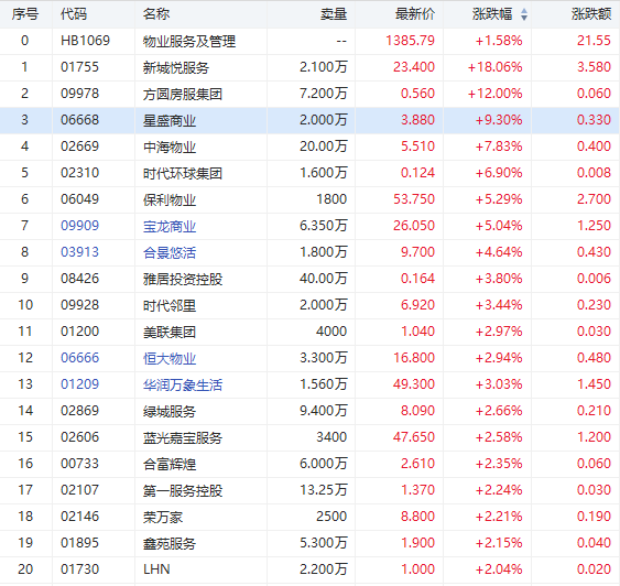 华盛资讯3月1日消息,物管板块持续向好,多只成分股盘中走高。截至发稿, 新城悦服务大涨超18%领涨板块,创一个多月新高,此前获纳入恒生综合指数;中海物业涨超7%,保利物业、宝龙商业涨超5%,合景悠活涨超4%,华润万象涨超3%,恒大物业、蓝光嘉宝涨超2%。