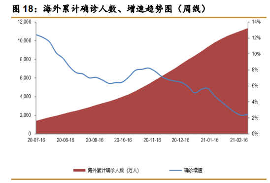 截至2月26日24 时,全球除中国外累计确诊病例 1.1357 亿例,全球死亡病例 251.5万例,死亡率2.21%。海外累计确诊增速 1 月以来持续下滑,得益于防控手段的加强和疫苗接种,海外疫情有望迎来拐点。上周确诊新增增速最高的 5 个国家为柬埔寨、爱沙尼亚、多 哥、喀麦、芬兰,累计确诊规模较小。