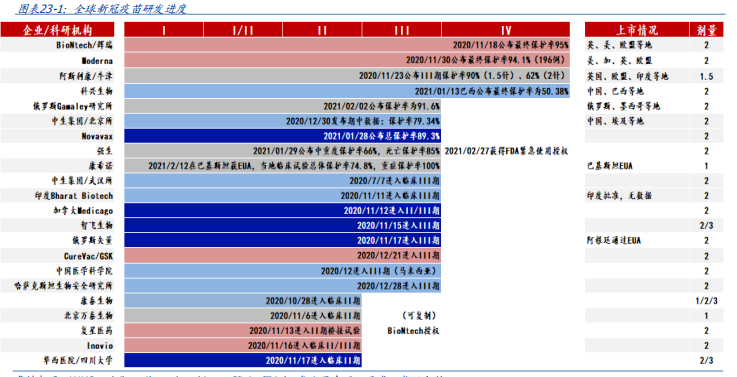 据WHO、公司官网统计目前9家的新冠疫苗在全球进度最快,辉瑞、Moderna、阿斯利康、科兴4家进入IV期临床,共17家进入/完成III期临床;12家企业处于II期,23家处于I/II期。