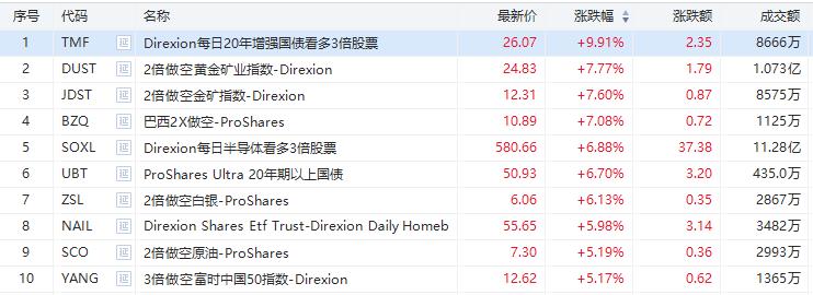美股上个交易日涨幅前十的ETF