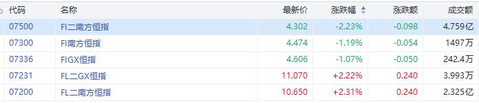 看空恒指相关ETF走弱,其中南方两倍看空恒指(07500.HK)跌2.23%,成交额4.76亿港元;南方一倍看空恒指(07300.HK)跌1.19%,成交额1497万港元。
