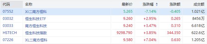 今日恒生科技指数涨3.85%。其中,南方两倍做多恒科(07226.HK)涨7.04 %,成交额1.21亿港元;做空两倍南方恒科跌7.14%,成交额1.02亿港元。