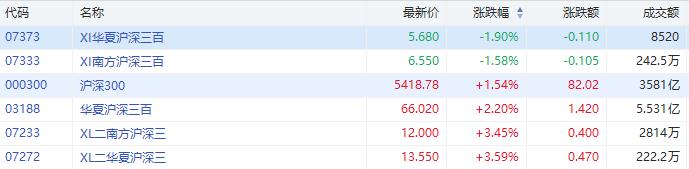 沪深300指数涨1.54%。其中,华夏沪深三百ETF涨2.20%,成交额5.53亿港元;两倍华夏做多沪深三百涨3.59%。