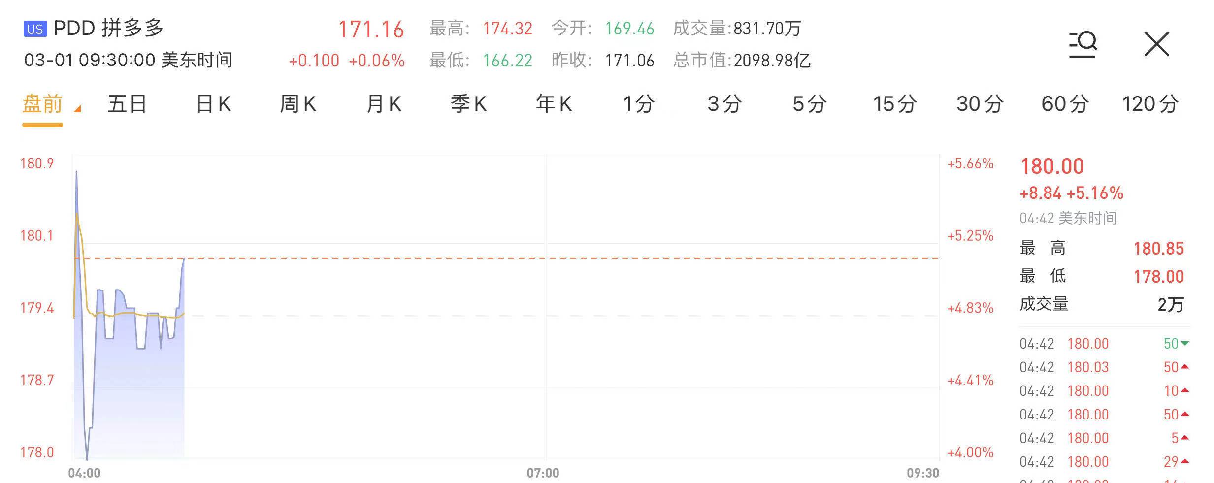 华盛资讯3月1日讯,拼多多盘前涨超5%,报180美元。