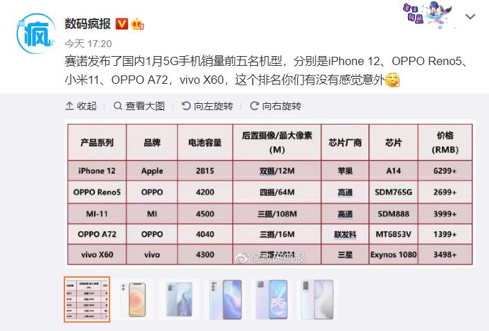 3月1日来自于“数码疯报”的消息显示国内知名的数据调研公司赛诺正式发布了2021年第一个月国内5G手机销量TOp5机型,下面来看一下具体排名: