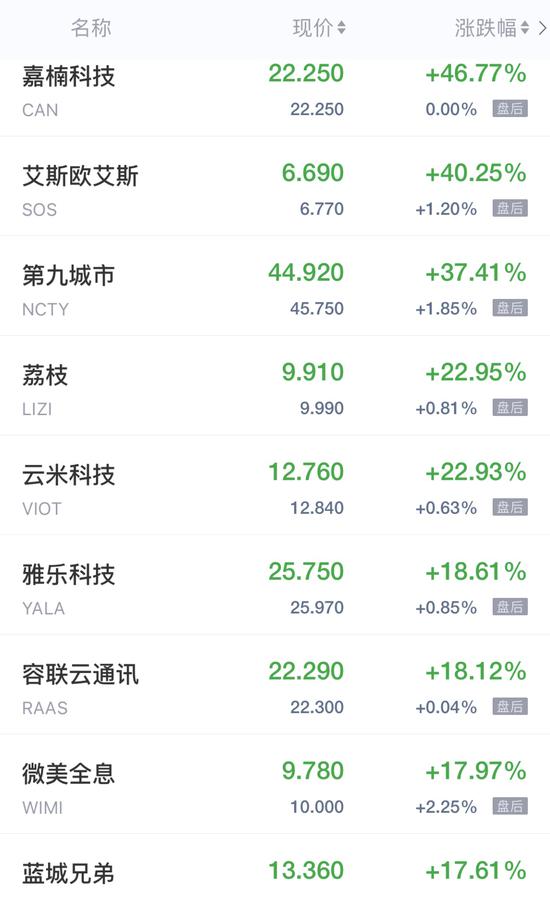 热门中概股周一收盘全线走高,区块链、音视频内容、新能源车股领涨,嘉楠科技飙升46%。