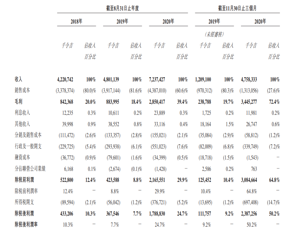 于截至2020年11月30日止三个月,收入及毛利分别为4758.3百万令吉及3445.3百万令吉,较截至2019年11月30日止三个月分别增加293.5%及1342.8%。毛利率由截至2019年11月30日止三个月的19.7%增加至截至2020年11月30日止三个月的72.4%。招股书指出,期内强劲业绩要归因于疫情期间手套产品前所未有的需求。