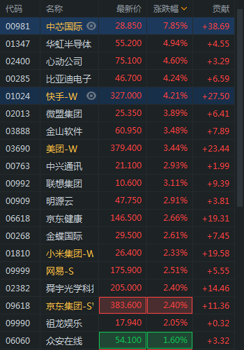 恒生科技指数大涨2.58% 中芯国际涨近8%美团涨超3%