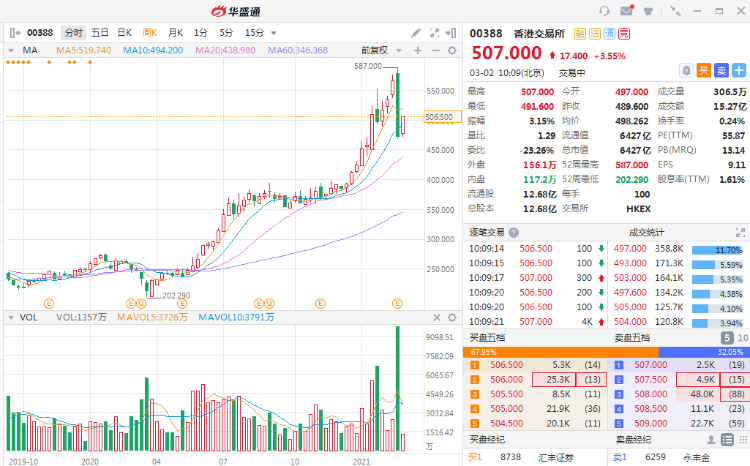 3月2日消息,港交所股价拉升涨超3%,现报507港元,市值6427亿港元。百度与B站将于3月同期于港交所上市。