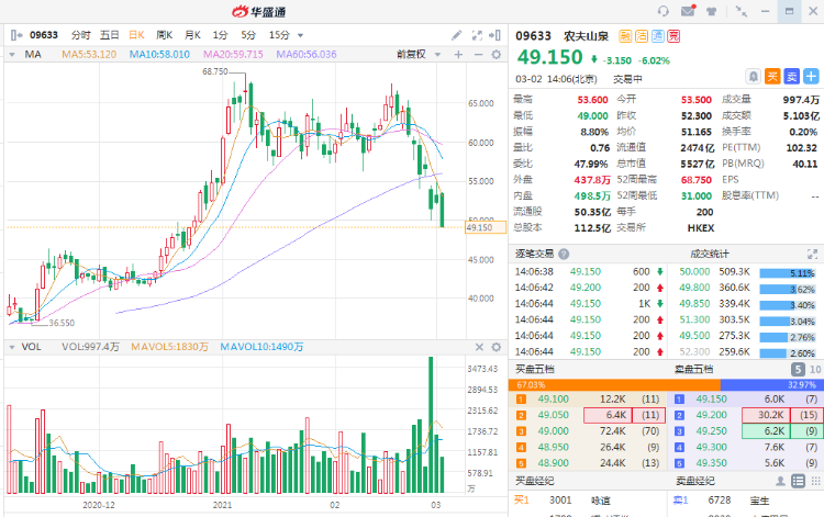 3月2日消息,农夫山泉跌幅扩大至6.02%,现报49.15港元,股价跌破50港元,为去年12月底以来新低。