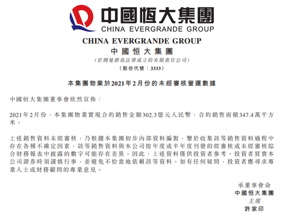 3月2日消息,中国恒大:2021年2月份,本集团物业实现合约销售金额302.3亿元人民币,合约销售面积347.4万平方米。