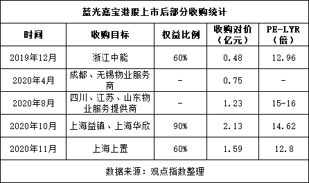 资料显示,2016年至2020年11月底,蓝光嘉宝相继收购25家物业公司部分或全部股份,主要分布于四川、江苏、上海、浙江、广东及宁夏;2020年上半年,新增收购8家物业公司,下半年则新增收购上海2家物业公司,以及东山物业、金罗马物业、上海上置物业等。