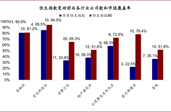 调整后,根据恒生指数公司提供的模拟结果,这一调整会使得指数对于冷门行业以及各个行业内部的覆盖度都明显改善。具体而言,变化最大的是那些目前覆盖度远低于50%的行业,如大消费将从11只增加值20只,医疗保健成分股将从当前的3只增至10只、资讯科技从4只增加值10只;相比之下,金融由于覆盖率已经较高,个数反而会从11只降至10只。
