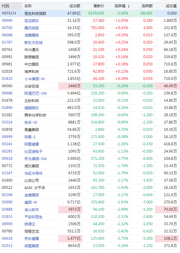 恒生科技指数跌1% 微盟集团跌5%京东健康跌超3%